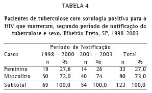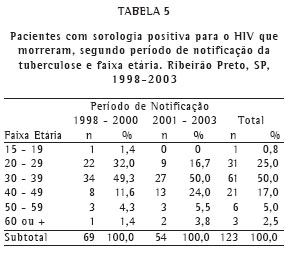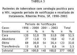 Em Ribeirão Preto, no período de 1998 a 2003, foram notificados 1.273 casos de TB, sendo que 377 apresentaram sorologia positiva para o HIV. A taxa média de co-infecção para o período estudado foi de 30%.