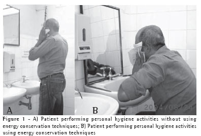 According to some authors,(22) the objectives of energy conservation and training of ADLs are the following: training diaphragmatic breathing, first at rest so that the patient acquires the perception of the respiratory movements during inspiration and expiration and, later on, during the performance of the tasks, avoiding the brief periods of apnea than can occur; training the upper limbs, with the objective of increasing exercise tolerance; programming activities with distinct levels of demand, beginning with light, slow activities that require less energy expenditure, such as personal hygiene activities performed while sitting, with upper limb support (brushing teeth, combing hair, shaving, face washing, applying makeup), followed by those performed while sitting without upper limb support (shaving armpits and showering); simplifying the performance of some tasks by adapting the environment (elevating the toilet seat and installing support bars/hand rails in the bathroom) or by using assistive technology (long-handled shoe horns, long-handled combs, walkers with seats and bags, etc.); eliminating unnecessary activities, such as dish drying (using a drain rack instead), drying after bathing (using a plush robe) and shoe tying (wearing slip-on shoes); informing patients of the importance of asking for help from family members, caregivers or others, when necessary; organizing time, planning the day/week, calculating the time spent in the performance of activities/the time needed for rest and encouraging the use of organizers; organizing the environment so that the materials that are going to be used by the patient are within reach, that is, between the scapular and pelvic girdles, reducing the need for broad movements of the upper limbs without support, as well as avoiding bending; educating the patient regarding the most appropriate postures for the performance of each task, adapting the way in which the activities are performed (using a table, counter, or even the bathroom basin, to support the arms, as well as eliminating the need to bend over.