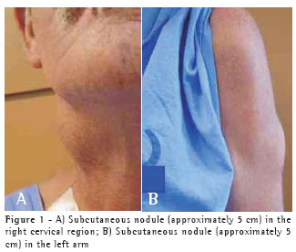 The physical examination revealed good general health status. However, in addition to the fever, there were rhonchi in both hemithoraces, and subcutaneous nodules (5 cm in diameter) were observed in the right cervical region and left arm, although without signs of inflammation (Figure 1).
