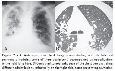 Chest X-ray revealed multiple nodules disseminated throughout both lungs (more prominent on the right side), accompanied by opacification of the right costophrenic sulcus. A computed tomography scan of the chest confirmed the presence of nodules of various sizes, some of which presented cavitation (Figure 2). The laboratory test results were normal, and the serology for human immunodeficiency virus was negative, as were the results of two blood cultures.