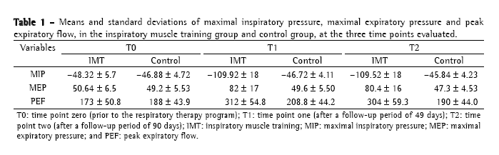 The results of the comparative analysis of MIP, MEP and PEF showed significant improvements in the IMT group-but not in the control group-between T0 and T1. For those same variables, there were no significant differences T1 and T2 for either group. This shows that the gains made in the IMT group were not lost after the end of the respiratory therapy.