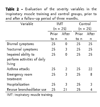 The two groups were compared in terms of PEF and respiratory muscle strength, as well as in terms of the following severity variables: frequent asthma attacks; diurnal symptoms; nocturnal symptoms; impaired ability to perform activities of daily living; emergency room treatment; hospitalization; and rescue bronchodilator use.