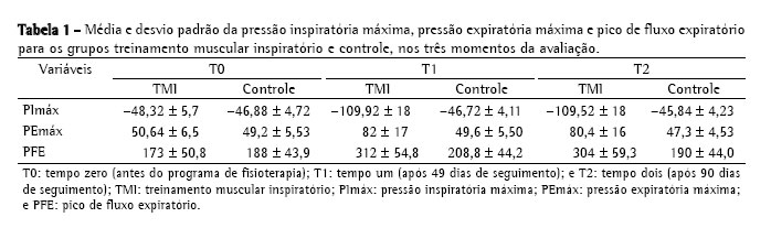 Conforme os resultados da análise comparativa das variáveis PImáx, PEmáx e PFE, podemos observar uma melhora significativa do grupo TMI na comparação entre o início do tratamento e após 49 dias de seguimento, resultado este não observado no grupo controle. Já a análise dos resultados da comparação das variáveis com 49 dias e com 90 dias de tratamento entre os grupos não foi significativa, mostrando que os ganhos obtidos no grupo TMI não foram perdidos após o término da fisioterapia.