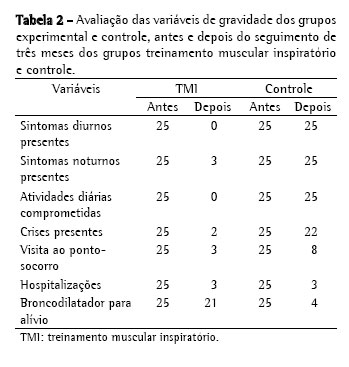 Também foi observada uma diferença significante para as médias das variáveis PImáx, PEmáx e PFE, entre grupo controle e grupo TMI, no instante T1 e no T2. Na avaliação comparativa dos grupos após a intervenção, referindo-se às variáveis de gravidade como freqüência de crises, atividades diárias, sintomas noturnos e diurnos e uso de medicamentos (Tabela 2), houve melhora significante no grupo TMI pós-tratamento, com p < 0,0001. Já na análise das variáveis visitas ao ponto-socorro e hospitalizações, não houve melhora significativa (p = 0,17) na comparação entre grupos.