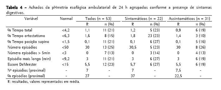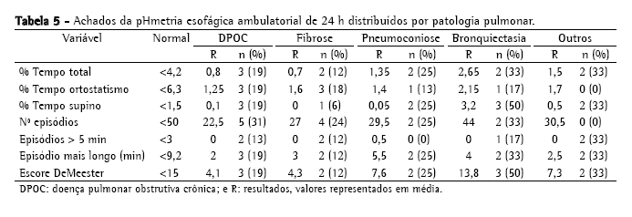 Apenas 5 pacientes (9%) apresentaram pHmetria anormal sem anormalidade detectável na manometria, enquanto que outros 6 pacientes (11%) não apresentaram qualquer tipo de alteração tanto na manometria quanto na pHmetria. Nos indivíduos submetidos à pHmetria com cateter de 2 eletrodos, o número de episódios de refluxo ácido que atingiram o eletrodo proximal foi percentualmente maior nos pacientes com sintomas digestivos do que nos assintomáticos. Os resultados da pHmetria distribuídos pelas doenças pulmonares de base revelaram que nenhuma doença apresentou mediana do escore de DeMeester acima da faixa normal (pontuação de 14,95), a despeito de os pacientes com bronquiectasias terem apresentado o maior número de pHmetrias anormais (Tabela 5).