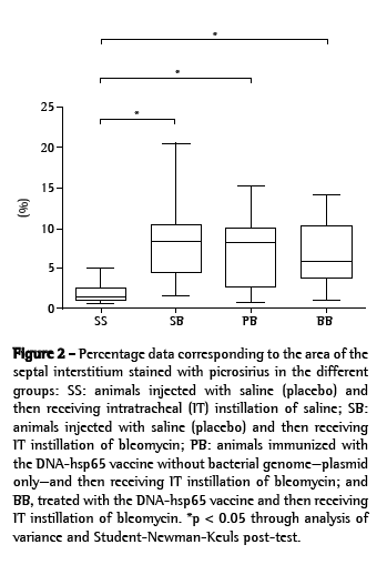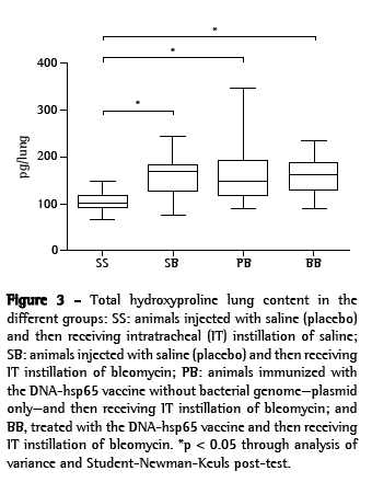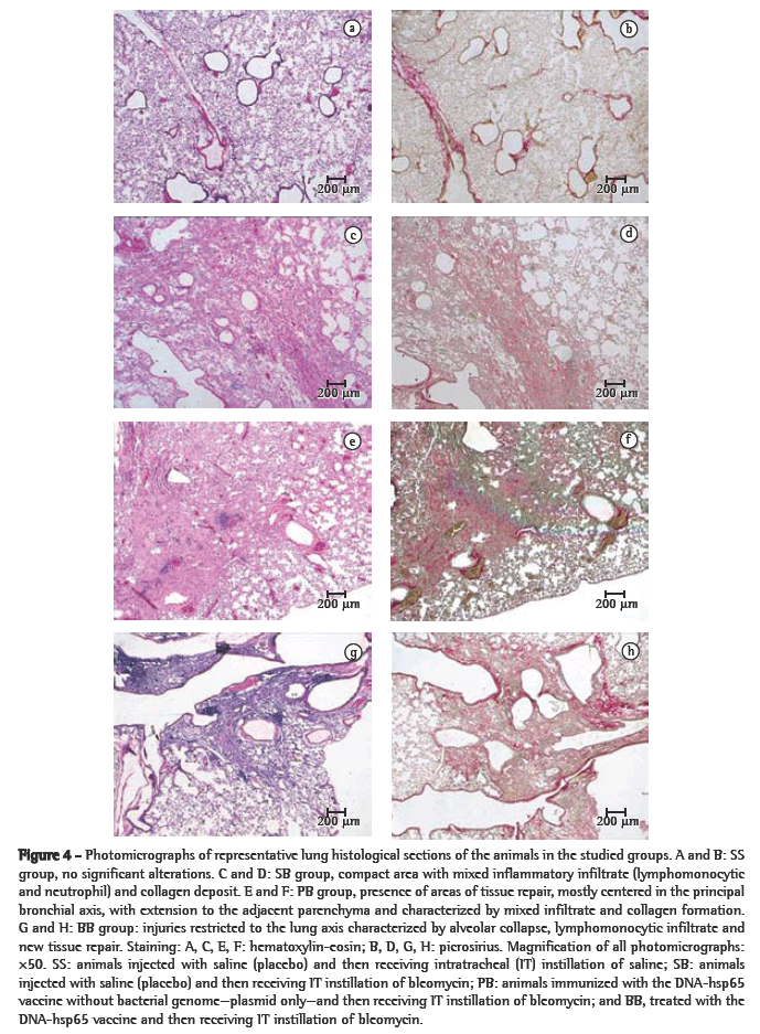 In summary, we can conclude that the data here obtained indicate that immunization with the DNA-hsp65 vaccine had a positive effect on the degree of deposition of the noncollagen matrix in a model of bleomycin-induced lung injury. Additional studies are necessary in order to elucidate more fully the effects that the vaccine has on pulmonary fibrotic processes.
