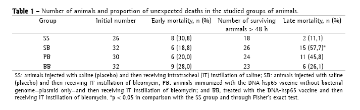 4) BB group: animals treated with the DNA-hsp65 vaccine and then receiving IT instillation of bleomycin