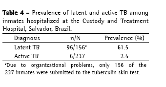 Prevalence of active and latent TB among inmates in a prison hospital in Bahia, Brazil
