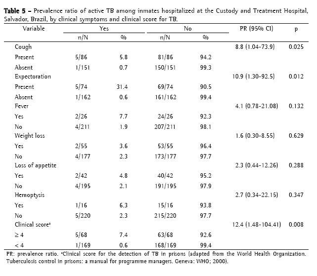 Two clinical symptoms were identified as predictors of active TB in the present study: cough and expectoration. The comparison of the prevalence of active TB in the groups with and without cough revealed a prevalence ratio (PR) of 8.8 (95% CI: 1.04-73.92; p = 0.025). Regarding expectoration, the PR of the two groups was 10.9 (95% CI: 1.30-92.0; p = 0.012). There were no statistically significant associations between the other clinical symptoms evaluated and active TB (Table 5): fever (PR = 4.1; 95% CI: 0.78‑21.08; p = 0.132); weight loss (PR = 1.6; 95% CI: 0.30‑8.55; p = 0.629); loss of appetite (PR = 2.3; 95% CI: 0.44‑12.26; p = 0.288); and hemoptysis (PR = 2.7; 95% CI: 0.34‑22.15; p = 0.347). Regarding the clinical scoring system suggested by the WHO for the detection of TB in prisons,(17) we used a maximum score of six, since the variable "chest pain" was not available in our database. Therefore, a cut-off point equal to or greater than four was used to define the probability of symptoms detecting the cases. The comparison of the two groups of inmates revealed a statistically significant association between scores equal to or greater than four and active TB (PR = 12.4; 95% CI: 1.48-104.41; p = 0.008).
