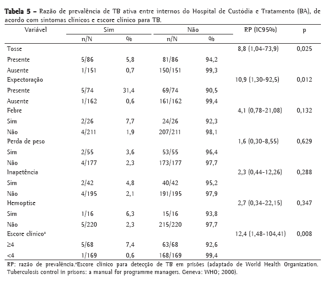 Dois sintomas clínicos foram identificados como preditores de TB ativa neste estudo: tosse e expectoração. Comparando as prevalências de TB ativa nos grupos com e sem tosse, foi evidenciada razão de prevalência (RP) de 8,8 (IC95%: 1,04-73,92; p = 0,025). Em relação à expectoração, a RP dos dois grupos foi de 10,9 (IC95%: 1,30-92,0; p = 0,012). Não foram encontradas associações estatisticamente significantes entre outros sintomas clínicos avaliados e TB ativa (Tabela 5): febre (RP = 4,1; IC95%: 0,78-21,08; p = 0,132), perda de peso (RP = 1,6; IC95%: 0,30‑8,55; p = 0,629), inapetência (RP = 2,3; IC95%: 0,44-12,26; p = 0,288), hemoptise (RP = 2,7; IC95%: 0,34-22,15; p = 0,347). Em relação ao escore clínico sugerido pela OMS para detecção de TB em prisões,(17) utilizamos uma pontuação máxima de seis, uma vez que não estava disponível no nosso banco de dados a variável "dor torácica". Assim, utilizamos para efeito de análise um ponto de corte com pontuação igual ou superior a quatro como de probabilidade de sintomas para detecção de casos.