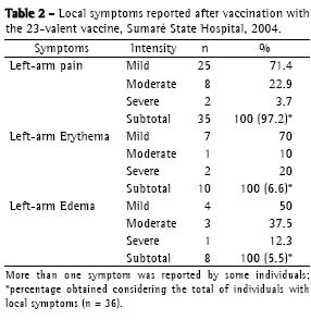 Results A total of 152 individuals were investigated, representing 76% of the 200 individuals who took part in the campaign. Of the 200 individuals, 47 were not found in three attempts, and one declined to complete the questionnaire. All 200 individuals were vaccinated against pneumococcal diseases, and 78 received only this vaccine (the 23-valent vaccine). In 36 (23.7%) of the 152 individuals evaluated, at least one local symptom was observed, possibly related to the vaccination against pneumococcal diseases. The local symptoms reported were pain, erythema, and edema. The profile of the individuals studied is shown in Table 1. Systemic symptoms were reported by 10 individuals (12.8%).