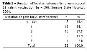 em indivíduos com indicação clínica, em Sumaré (SP) (630.000 habitantes). Métodos: Foram investigados prospectivamente 152 indivíduos após vacinação (0,5 mL intramuscular Pneumo23® Aventis Pasteur, Espanha) em um hospital geral. A variável de estudo foi a queixa de