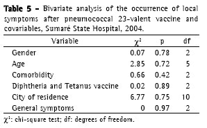 Complaints of adverse effects at the site of administration were investigated in the 152 individuals receiving the 23-valent vaccine, and systemic symptoms were investigated in the 78 individuals who received only this vaccine. Since both vaccines against pneumococcal diseases and against diphtheria/tetanus - were offered, the systemic symptoms of the 74 individuals who received both vaccines were not considered. The research was approved by the Ethics in Research Committee of the State University at Campinas School of Medical Sciences (process no. 215/2005). The 23-valent vaccine administered was Pneumo23® vaccine (lot X0056-1; Aventis Pasteur, Madrid, Spain), which was injected intramuscularly into the left arm in a dose of 0.5 mL. The vaccine against diphtheria and tetanus was administered in the right arm. The outcome measure was the complaint of at least one symptom related to the vaccination. Only local symptoms in the left arm with temporal connection with vaccination, that is, within 48 h after the administration of the vaccine, were considered.(1) The covariables investigated were as follows: age, gender, place of residence, clinical indication for the vaccine, and reporting having chronic diseases.