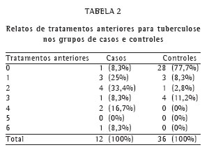 Em relação ao número de tratamentos realizados anteriormente para tuberculose, foi observada uma média de 0,9, variando de zero a seis, e foi em maior número nos casos do que nos controles. Somente um caso (1/12) não tinha sido submetido a tratamento prévio. Nos controles, 77% deles (28/36) não tiveram tratamento prévio para tuberculose. Foi descrito em outro estudo que 85,4% dos pacientes portadores de tuberculose multirresistente apresentaram dois ou mais tratamentos anteriores para tuberculose, valor próximo do achado neste estudo, que foi de 91,6%.(18-19) A média de tratamentos anteriores para tuberculose foi de 2,3 tratamentos para os casos e 0,47 para o grupo controle. Estes dados são similares aos do Brasil, onde os casos com tuberculose multirresistente tiveram uma média de 2,8 tratamentos prévios para tuberculose.(4)