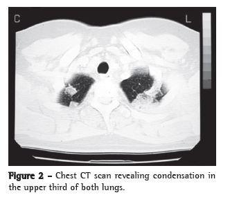A chest X-ray, performed two months after the onset of symptoms, showed bilateral apical pulmonary opacification and mild left hilar lymph node enlargement (Figure 1). Chest CT scans showed condensation in the upper third of both lungs (Figure 2), as well as left hilar lymph node enlargement and right pleuritis (Figure 3). A sinus X-ray was normal.