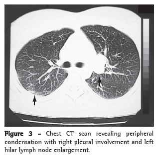 Case reportA 28-year-old white male, who was a physician and a resident of the city of Ribeirão Preto, Brazil, presented with a three-month history of daily fever (37.5-38.5°C). He also presented with intense nonproductive cough, chest pain in the right subscapular region, loss of appetite and malaise. The patient received a nonsteroidal anti-inflammatory drug for 10 days, and the symptoms were attenuated. With the discontinuation of the drug, the fever returned, together with headache, malaise and productive cough with yellow expectoration. The patient received amoxicillin/clavulanate, and the expectoration decreased. However, he had dry cough, loss of appetite, prostration, weakness, night sweats and irregular fever, all of which had intensified within the last few days. In addition, he had lost approximately 4 kg of body weight.