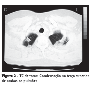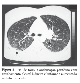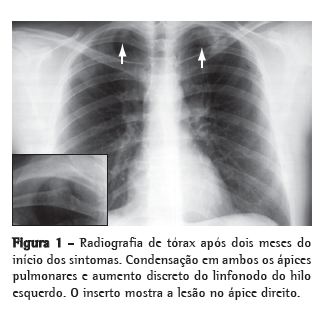 Uma radiografia de tórax, feita dois meses após o início dos sintomas, mostrava velamento pulmonar apical bilateral e discreto aumento do linfonodo hilar esquerdo (Figura 1). A TC de tórax mostrou condensação do terço superior de ambos os pulmões (Figura 2), aumento do linfonodo do hilo pulmonar esquerdo e pleurite à direita (Figura 3). A radiografia dos seios da face foi normal. A ultrassonografia de abdômen revelou esplenomegalia discreta. A broncoscopia mostrou árvore brônquica normal.