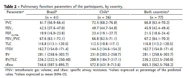 One limitation of our study is that our two groups of patients with PIBO were each from a different country. However, since both of those countries are in the southern portion of South America, there are geographic, ethnic, and nutritional similarities between the two groups. In addition, they all developed the disease at similar (young) ages, corresponding to simultaneous regional bursts of severe adenovirus respiratory infections during the early and mid 1990s.(28) Furthermore, the measurements corresponded to pulmonary function testing obtained during the same year, both pulmonary function testing laboratories are board certified, both follow the ATS/ERS recommendations, and both used the same apparatus and software. The group results are presented together with those of the sample as a whole, and it is clear that the two patient groups were similar in terms of pulmonary function.