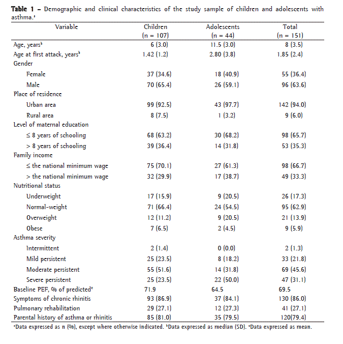 ResultsWe studied 151 asthma patients, of whom 107 (70.9%) were children with a median age of 6 years and 44 (29.1%) were adolescents with a median age of 11 years. Although there was a preponderance of boys (n = 70, 65.4%; p < 0.001) among the children, no such difference was found among the adolescents. The majority of the children (92.5%) and adolescents (97.7%) resided in the urban area of the city of Feira de Santana, Brazil. In most cases, the level of maternal education was ≤ 8 years of schooling (65.7%; p < 0.001) and the family income was ≤ the national minimum wage (66.7%; p < 0.001; Table 1).