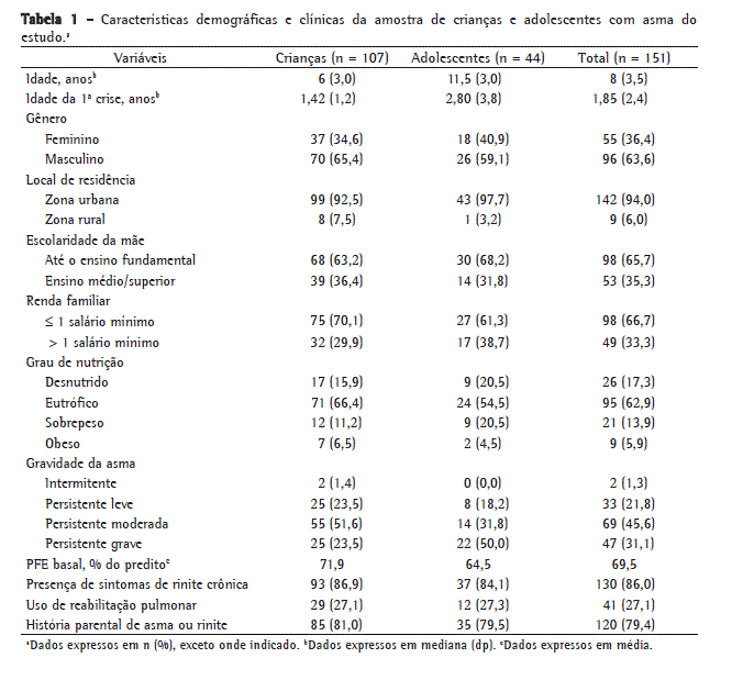 Foram estudados 151 pacientes asmáticos de ambos os gêneros, sendo 107 crianças (70,9%) com mediana de idade de 6 anos e 44 adolescentes (29,1%) com mediana de idade de11 anos. Houve predominância de meninos (n = 70, 65,4%; p < 0,001) entre as crianças, mas não houve diferença entre os gêneros entre os adolescentes. A maioria das crianças (92,5%) e adolescentes (97,7%) residiam na zona urbana de Feira de Santana (BA). A maioria significativa das mães tinha escolaridade somente até o ensino fundamental (65,7%; p < 0,001) e renda familiar de até um salário mínimo (66,7%; p < 0,001; Tabela 1).