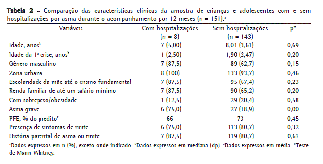 Os fatores de risco associados às hospitalizações em crianças não inseridas em programas específicos para assistência à asma têm sido tratamento inadequado, ausência de acompanhamento adequado durante o tratamento da asma, baixo nível socioeconômico, faixa etária menor de 5 anos e exacerbações recentes.(6-9) Estudos abordando as características clínicas e os fatores preditores de hospitalizações em crianças que utilizam medicação anti-inflamatória para o tratamento da asma durante acompanhamento regular em um ambulatório de referência não foram encontrados. A caracterização dessas crianças e a identificação de preditores para a utilização de serviços de emergência e hospitalizações durante o acompanhamento pode contribuir para um melhor controle da doença, reduzindo o risco de hospitalizações por asma durante o tratamento e a consequente utilização de recursos da saúde.(10,11)