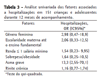 No período do estudo, houve 12 hospi­ta­­li­zações, envolvendo 8 pacientes (5,2%) - 6 crianças e 2 adolescentes, sendo que 6 desses tinham asma grave. Dentre as covariáveis testadas, a gravidade da asma mostrou elevada razão de chances para hospitalização (OR = 13,3; IC95%: 2,55-70,1; Tabela 3).