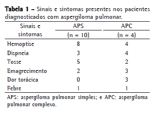 Entre 1981 e 2009, foram admitidos e atendidos no Hospital das Clínicas da Faculdade de Medicina de Botucatu da Universidade Estadual Paulista, localizado na cidade de Botucatu (SP), 19 portadores de aspergiloma pulmonar, com idades variando entre 20 e 80 anos (média ± dp = 47,8 ± 14,5 anos). Desses 19 pacientes, 11 eram mulheres e 8 eram homens. Um paciente faleceu antes da ressecção pulmonar em decorrência de hemoptise maciça seguida de choque hipovolêmico, 3 recusaram o tratamento cirúrgico e 1 teve o tratamento cirúrgico contraindicado devido sua má condição clínica. Dessa forma, 14 portadores de aspergiloma pulmonar foram submetidos a tratamento cirúrgico, com idades variando entre 20 e 63 anos (média ± dp = 44,2 ± 12,9 anos), sendo 7 homens e 7 mulheres. Dos 14 pacientes, 10 apresentaram APS e 4 apresentaram APC.