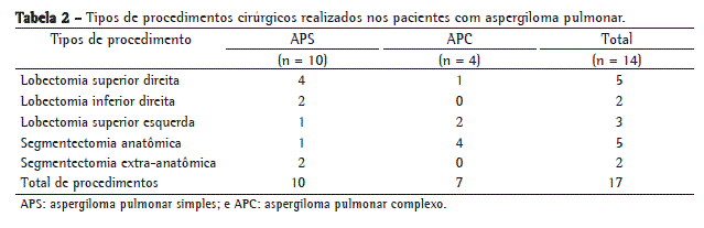 A mortalidade e morbidade operatória estão relacionadas ao tipo de aspergiloma pulmonar.(2,3) No APC, a mortalidade é maior que no APS, em decorrência de complicações pós-operatórias mais frequentes, como fuga aérea prolongada, empiema e sangramento.(3,5,9,10)