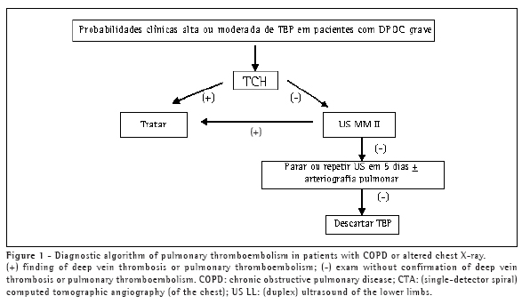It is usual for patients with severe COPD to present hypoxemia due to the dispersion of the V/Q ratio. Hypoxemia is usually accentuated by acute exacerbations or by PTE episodes. It has been suggested that a diagnosis of PTE should be considered when there is a reduction in PaCO2 in a previously hypercapnic patient. However, in some patients with COPD, due to the inability of the minute volume to compensate for the increased dead space (caused by PTE or by the redistribution of the minute volume to the alveolar dead space), PaCO2 might not be reduced and might even increase. A diagnosis of PTE should be considered in any patient with severe COPD who presents worsening of dyspnea and decreased exercise tolerance, and who does not respond to conventional treatment with bronchodilators.