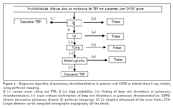 Once the suspicion has been raised, an additional challenge is to make the diagnostic confirmation within the constraints of the cost-benefit ratio. In recent decades, V/Q mapping has been the principal instrument of PTE diagnosis. Among the COPD patients in the PIOPED study sample,(27) 60% of V/Q mapping results were found to be of intermediate probability, compared with 33% among the patients without previous lung disease.(42) However, in 19% of the patients with COPD, the V/Q mapping results were of high or normal probability or there was concordance between the clinical manifestations and low probability. High or normal probability V/Q mapping results were not affected by the underlying disease. In a previous study,(35) it was demonstrated that, despite the COPD diagnosis, V/Q mapping constitutes a reliable method of detecting PTE if the abnormalities found in the ventilatory study were not very extensive.