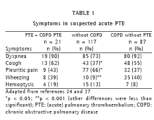 In one study,(24) the PIOPED cases(27) were reviewed, and the authors found that the PTE patients with COPD (n = 21) differed from the PTE patients without previous heart or lung diseases (n = 117): in the group with COPD, pleuritic pain was less frequent (p < 0.005), whereas cough (p < 0.05) and wheezing (p < 0.001) were less frequent in the group without previous heart or lung diseases (Table 1).