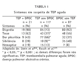Alguns autores,(24) revisando a casuística do PIOPED,(27) constataram que pacientes com DPOC (n = 21) que tiveram TEP diferiam de pacientes com TEP sem doença cardíaca ou pulmonar prévias (n = 117): no grupo com DPOC, dor pleurítica foi menos freqüente (p < 0,005), enquanto que tosse (p < 0,05) e sibilância (p < 0,001) foram menos freqüentes no grupo sem doença cardíaca ou pulmonar prévias (Tabela 1).