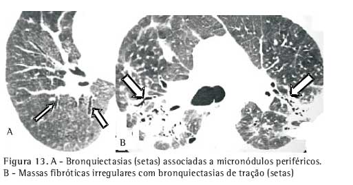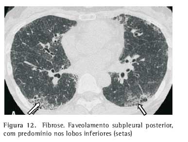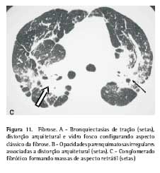 Fibrose. As anormalidades parenquimatosas podem evoluir para fibrose, que está associada a distorção arquitetural, perda volumétrica, opacidades lineares, faveolamento, massas fibróticas, bronquiectasias e bronquiolectasias de tração, usualmente nos campos pulmonares médios e superiores (Figuras 11 e 12)(7).