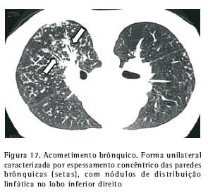 Alterações brônquicas (espessamento/estenose). Lenique et al. encontraram espessamento das paredes brônquicas em 65% dos pacientes, causado pela deposição de granulomas ao longo do interstício peribroncovascular (Figura 17)(19).