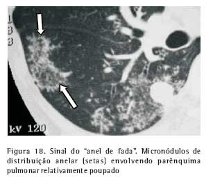 Este aspecto decorre de múltiplos nódulos granulomatosos periféricos margeando áreas de parênquima pulmonar preservado (Figura 18)(20).