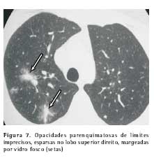 Opacidades parenquimatosas. São menos freqüentes que as opacidades em vidro fosco e geralmente surgem no estágio inicial da doença. Localizam-se ao longo dos feixes peribroncovasculares ou na periferia pulmonar. Suas margens são irregulares, sendo freqüente a associação com broncogramas aéreos e nódulos no parênquima adjacente (Figuras 6 e 7)(14).
