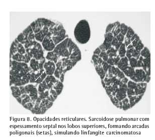 Opacidades reticulares. Resultam de uma combinação de espessamento dos septos interlobulares e do interstício intralobular. O espessamento septal localiza-se preferencialmente ao longo dos feixes peribroncovasculares, mas pode ocorrer em outras topografias (Figura 8).