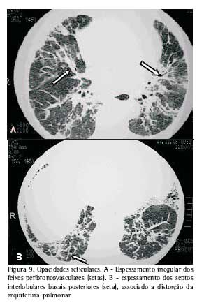 Opacidades lineares irregulares foram também descritas junto aos feixes broncovasculares e atribuídas a manifestações precoces da fibrose pulmonar (Figura 9)(7,9).