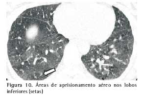 Aprisionamento aéreo. O aprisionamento aéreo na expiração é relativamente freqüente, ocorrendo devido à presença de granulomas peribrônquicos ou submucosos ou por fibrose peribronquiolar, ocasionando obliteração das pequenas vias aéreas (Figura 10) (15).
