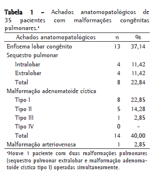 Os achados anatomopatológicos dos 35 pacientes analisados estão descritos na Tabela 1. Um paciente apresentou associação de MAC tipo I e sequestração pulmonar extralobar.