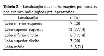 Todos os pacientes foram submetidos a algum tipo de exame de imagem para o diagnóstico pré-operatório: 28 pacientes (80%) foram submetidos à TC de tórax, 35 realizaram radiografia simples de tórax, e apenas 4 tinham diagnóstico pré-natal através de ultrassonografia (11,42%), sendo 3 casos de MAC e 1 caso de sequestração pulmonar extralobar. As localizações das lesões estão especificadas na Tabela 2, enquanto os