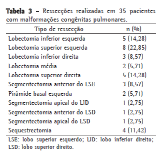 Objective: To determine the main congenital lung malformations treated and the principal diagnostic methods employed, as well as the indications for surgical treatment and the results obtained, at a referral facility for pediatric thoracic surgery. Methods: We reviewed the medical charts of 52 patients anatomopathologically diagnosed with congenital lung malformations and who had been submitted to pulmonary resection between January of 1997 and December of 2006. Exclusion criteria were age ≥ 12 years and incomplete clinical data. The final sample comprised 35 patients. Results: In this sample, the mean age was 31 months, and there was a predominance of males (n = 21). The anatomopathological findings were cystic adenomatoid malformation (n = 14), congenital lobar emphysema (n = 13), pulmonary sequestration (n = 8) and arteriovenous malformation (n = 1). The most common type of lung resection was left lower lobectomy (in 25.71%) followed by different types of segmentectomy (in 22.85%), left upper lobectomy (in 22.85%), right upper lobectomy (in 14.28%), right lower lobectomy (in 8.57%) and middle lobectomy (in 5.71%). Of the 35 patients, 34 (97.14%) were submitted to closed pleural drainage, with a mean duration of thoracic drainage of 3.9 days. Ten patients (28.5%) presented with postoperative complications. There were no deaths in our sample. Conclusions: Pulmonary resection for the treatment of congenital lung malformations is a safe procedure, presenting low morbidity and no mortality at a referral facility for pediatric thoracic surgery.