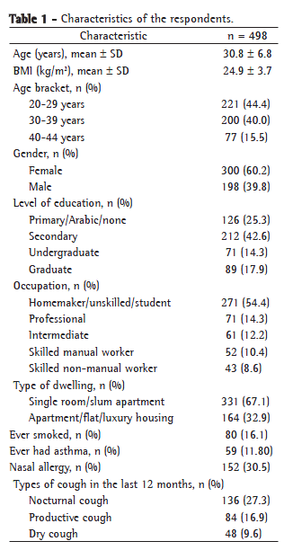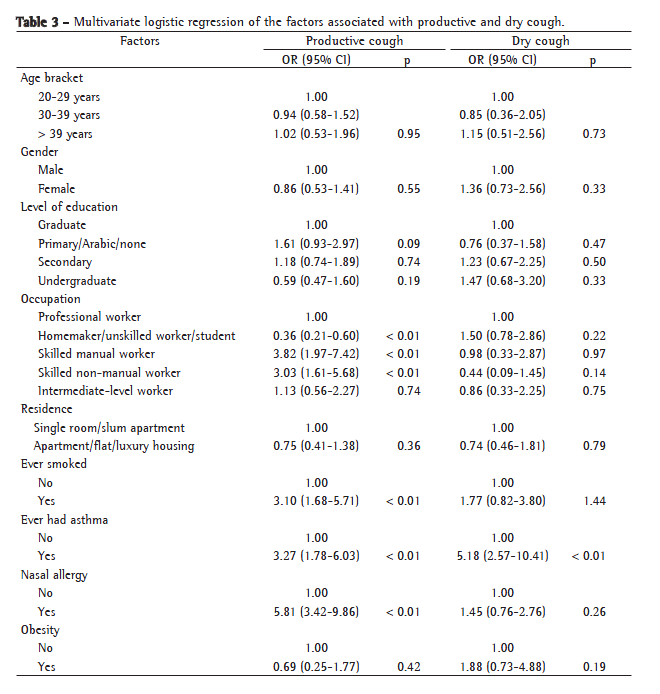 We enrolled 498 subjects, of whom 300 (60.2%) were male and 198 (39.8%) were female. In the sample as a whole, the mean age was 30.8 ± 6.7 years. Of the 498 subjects, 136 (27.3%) reported nocturnal cough and 362 (72.7%) reported no nocturnal cough (p < 0.001), whereas 80 (16.0%) reported productive cough and 48 (9.6%) reported dry cough. Among the subjects who reported cough, the mean age was 31.0 ± 7.0 years (Table 1). The multivariate logistic regression showed that subjects who had ever had asthma were eleven times more likely to have nocturnal cough, those with nasal allergy were six times more likely to have nocturnal cough, and those who had ever smoked or had engaged in skilled manual work were three times more likely to have nocturnal cough. Subjects who were between 30 and 39 years of age were more likely to report nocturnal cough, as were those who were female, those who had only a primary school education and those living in a single room or in a slum apartment, although the differences were not statistically significant (Table 2). Skilled manual workers were four times more likely to report productive cough.