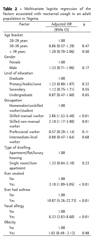 Objetivo: Determinar os fatores associados à tosse seca, tosse produtiva e tosse noturna entre jovens adultos na Nigéria. Métodos: Foram avaliados 498 indivíduos com 20-44 anos de idade em Ilorin, Nigéria, utilizando-se o questionário European Community Respiratory Health Survey (ECRHS), administrado por entrevistadores treinados. Resultados: A tosse noturna apresentou associações com asma (OR = 10,87; p < 0,01), alergia nasal (OR = 6,33; p < 0,01), tabagismo (OR = 3,10; p < 0,01), trabalho manual e trabalho não manual especializados (OR = 2,86 e 2,10, respectivamente; p < 0,01 para ambos) e gênero feminino (OR = 1,33; p = 0,17). A tosse produtiva apresentou associações com trabalho manual e trabalho não manual especializados (OR = 3,82 e 3,03, respectivamente; p < 0,01 para ambos), tabagismo (OR = 3,10; p < 0,01), asma (OR = 3,27; p < 0,01) e alergia nasal (OR = 5,81; p < 0,01). A tosse seca apresentou associações com asma (OR =5,18; p < 0,01) obesidade (OR =1,88; p = 0,19), tabagismo (OR = 1,77; p = 1,44), alergia nasal (OR = 1,45; p = 0,26) e gênero feminino (OR =1,36; p = 0,33). A idade, o gênero, o tipo de residência e a obesidade não se associaram significativamente a nenhum tipo de tosse (p > 0,05). Conclusões: A prevenção precoce e o tratamento de condições associadas à tosse, assim como a modificação de fatores sociais comumente associados à tosse, são necessários a fim de reduzir a morbidade respiratória.