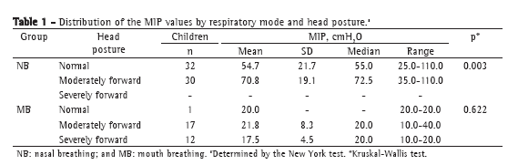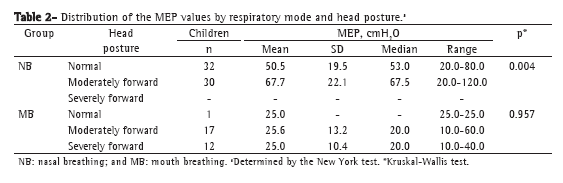 In our study, MIP and MEP were not found to be associated with head posture in the MB group children. In contrast, in the NB group, we observed that a more severely forward head posture translated to higher MIP and MEP values. This suggests that nose-breathing children use this as a compensatory mechanism, thus achieving higher MIP and MEP values than do those who retain a normal head posture. In contrast, mouth-breathing children seem to have more severe postural impairment, lacking compensatory resources to perform the maneuvers. Because we found no studies assessing these associations, further studies are needed in order to confirm and explain changes in respiratory muscle strength in relation to respiratory mode and forward head posture. Although we did not find a relationship between musculoskeletal change and lung disease in mouth-breathing subjects, Silveira et al.(29) observed that forward head posture correlated negatively with spirometric variables in mouth-breathing subjects.