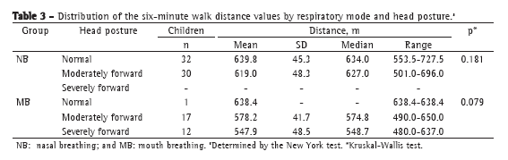 In the present study, the 6MWT proved to be sensitive and reproducible in mouth-breathing children. Although there have been no studies on the use of the 6MWT in children with CMB, this test has been considered a good tool for assessing functional capacity because it is simple, inexpensive, and easily applied, providing an overall analysis of the respiratory, cardiac, and metabolic systems.(30)