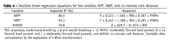 After multivariate analysis by multiple linear regression of MIP and MEP in relation to gender, age, respiratory mode, and forward head posture, the best adjusted model for MIP (adjusted R2 = 60.4%) included only the variables respiratory mode and forward head posture. Mouth breathing was associated with lower MIP, whereas postural change was associated with higher MIP. The same was observed for MEP (adjusted R2 = 44.2%; Table 4). The same adjustment was applied to the 6MWD. In this case, only the variable respiratory mode remained in the model, and the standard deviations were lower in the MB group (adjusted R2 = 26.6%; Table 4).