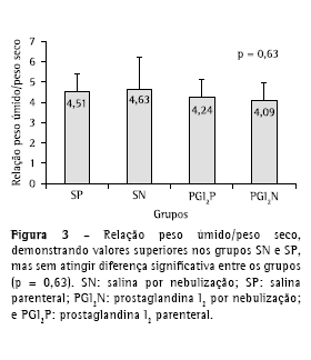 A média do peso dos animais não diferiu entre os grupos: 312 g, 319 g, 317 g e 317 g, respectivamente, nos grupos SN, SP, PGI2N e PGI2P (p > 0,05).