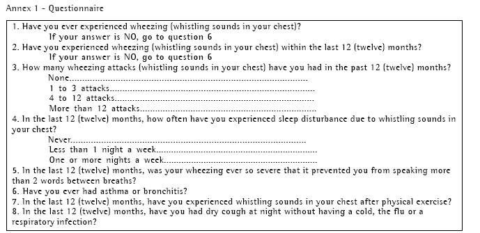 Although the questionnaire seems appropriate for the identification of individuals with asthma, it has little use in the evaluation of clinical relevance and patient impairment, which is important for estimating the cost or severity of the disease in epidemiologic studies. Keeping the original questionnaire intact and adding questions on the use of medication, date of symptom onset, wheezing not concomitant with the flu, and history of bronchitis would make significant contributions to the wider use of this instrument. It would be interesting to test this instrument in a population-based survey in order to determine its validity in a group presenting a wider distribution of symptoms.