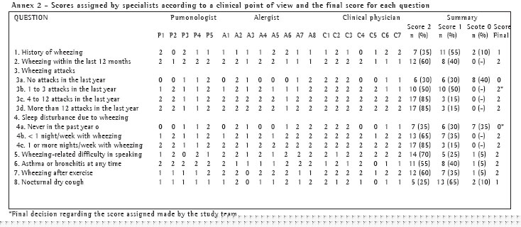 RESULTSAnnex 2 shows the distribution of the scores assigned by the specialists, the percent distribution and the final score for each question. For question 3b ("Have you had between 1 and 3 asthma attacks in the past year?"), the number of specialists who considered this information important for the diagnosis of asthma (ten) was equal to that of those considering it helpful but not fundamental. The study team concluded that this information was important and therefore assigned a score of two to this question. Similarly, seven specialists considered question/statement 4a ("I have not been awoken by an attack within the last year.") important for the diagnosis of asthma, and seven did not. We decided to attribute a score of zero to this information, indicating that the absence of sleep disturbance caused by wheezing attacks was not important for the diagnosis of asthma.